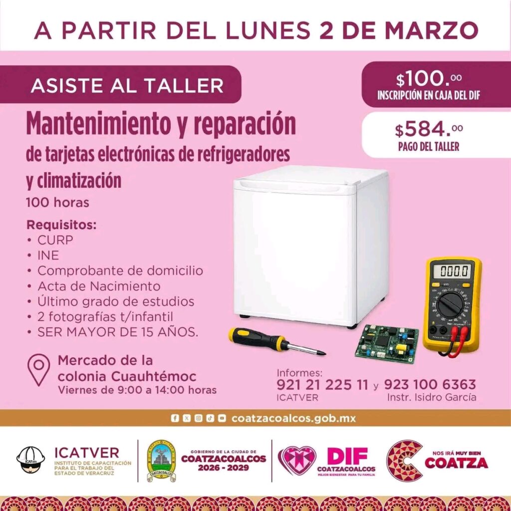 – Mantenimiento y reparación de tarjetas electrónicas de refrigeradores y climatización — 100 horas. Informes 921 212 2511 y 923 100 6363.