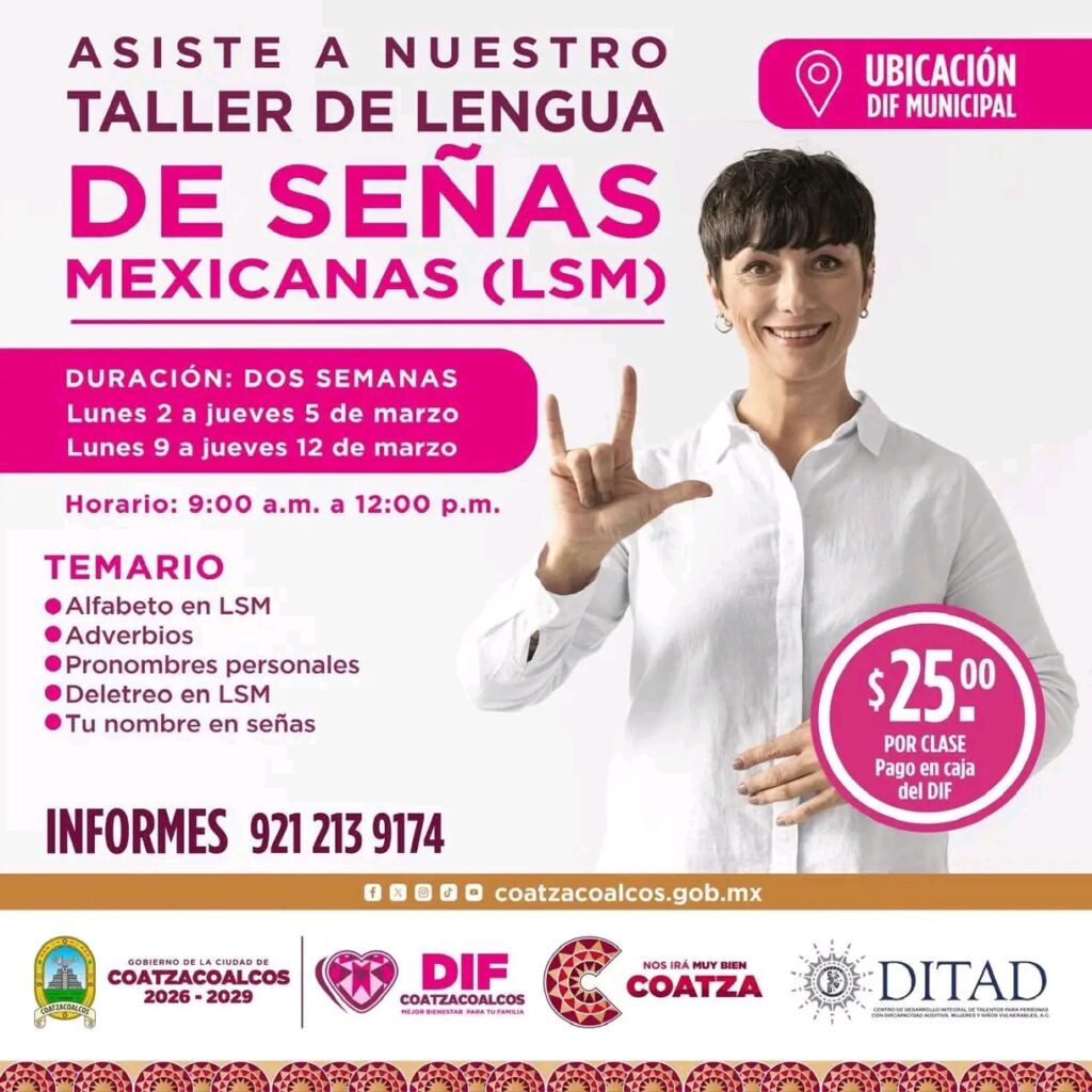 El DIF Coatzacoalcos, en colaboración con el Centro de Desarrollo Integral de Talentos para Personas con Discapacidad Auditiva, Mujeres y Niños Vulnerables A.C. (DITAD), abre también inscripción para el taller de Lengua de Señas Mexicanas (duración: dos semanas). En este taller se trabajarán el alfabeto en LSM, adverbios, pronombres personales y deletreo en LSM. Costo por clase 25 pesos a pagar en caja DIF.