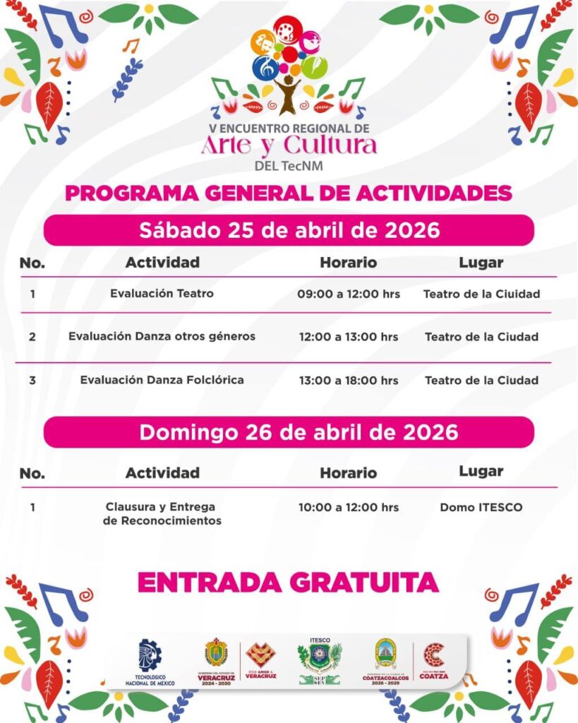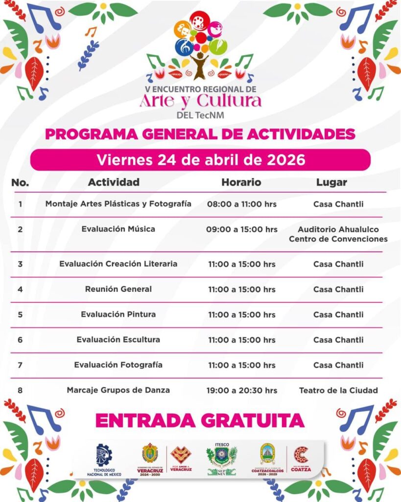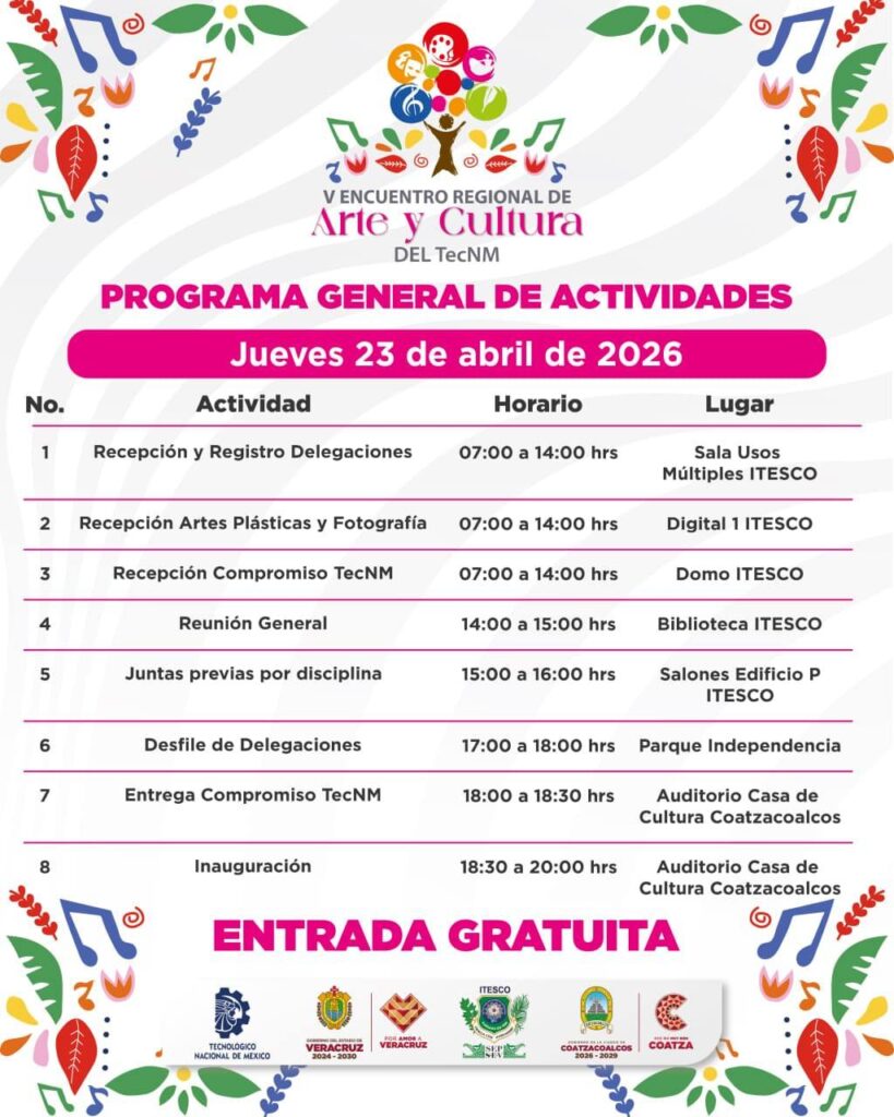 Coatzacoalcos, Ver . – El municipio se alista para convertirse en el epicentro de la expresión creativa con la realización del Encuentro Regional de Arte y Cultura, evento que se llevará a cabo del 23 al 26 de abril. Esta jornada cultural es el resultado de un esfuerzo coordinado entre el Instituto Tecnológico Superior de Coatzacoalcos (ITESCO), el Gobierno Municipal y el Gobierno del Estado de Veracruz.